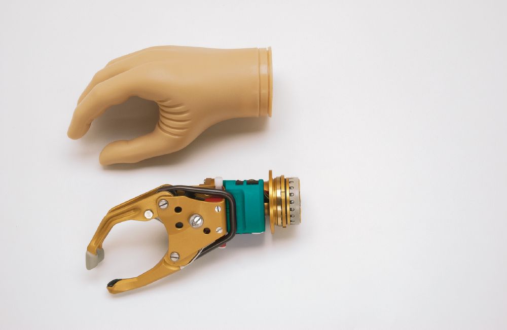 拇指、示指、中指からなる指部品とリレースイッチ、モーター部分からなるグリップ部分、手継手接合部から構成される。手継手接合部は、クイックチェンジ型が8E38、手関節離断型が8E39となり、どちらの型式も、我が国において十分な臨床使用実績がある。既存のハンド(DMCとデジタル、センサーハンド)からの変更は、接合部より遠位部分(スイッチとモーター)のみである。 |