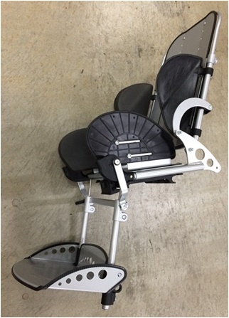 角度調整可能なジョイントで、体幹支持部、座面支持部、足部支持部が連結されている。体幹支持部および座面支持部はアルミのプレートを重ねて構成されており、ボルトを緩めてスライドさせることで、体型や成長に合わせた調整が可能。 |