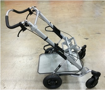 キンバ フレーム(470G71=5_AA03_C 完成用部品既収載品)のシート取付け部を約8.5cm上方に配置し、シート下のスペースを拡大。そこに1枚式の大型トレイを配置し、医療デバイス等の積載を可能にした。 ユーザー+シートユニット+医療デバイスの合計積載量を80kgまで可能にするため、フレームのジョイント等に補強を加えた。 |