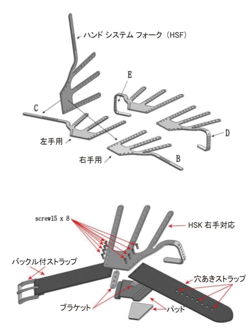 装着する指の本数、手掌部の形状によって、受注時に加工調整され、義肢装具士へ提供される。切断指に応じて不要なHSF部分をカット・研磨し、手部形状に合わせて曲げ加工を施して義肢装具士へ提供される。最終的な適合は、義肢装具士による観察に基づき、ヒンジ部の取付位置をHSF部分の長さを調整し、ネジ止めする。 |