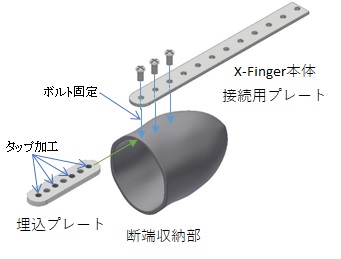 断端を覆うシリコーンの背側にタップ加工を施したプレートが埋め込まれている。タップ穴を利用してX-Finger-MBU本体部との接続用プレートを取付ける。 |