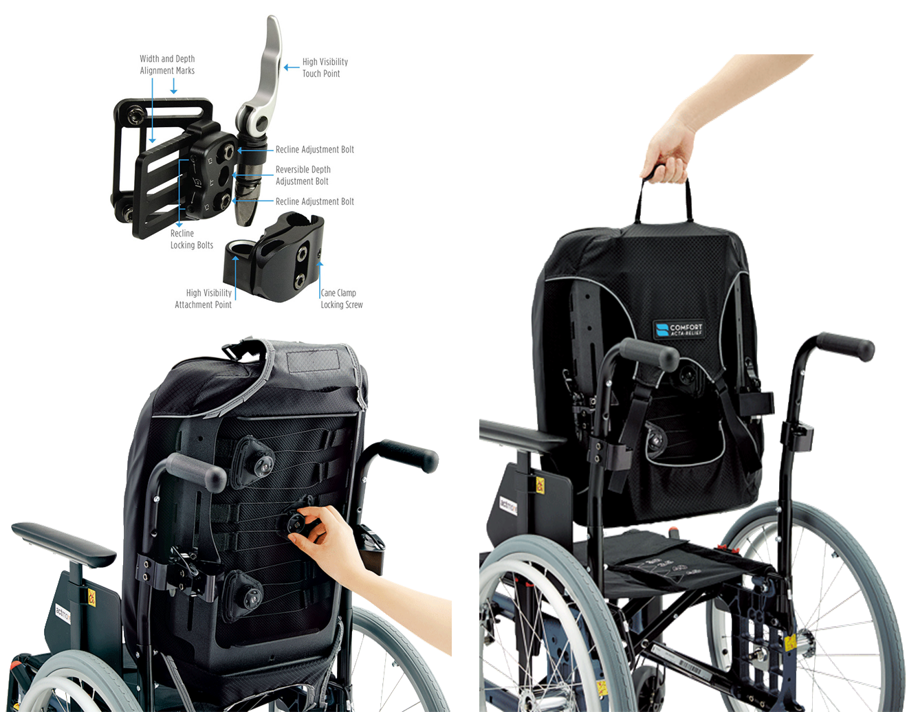 車いすの背パイプへ専用の受け金具を装着。強固なベース、張り調整機構、背カバーによって構成。張り調整機構に設けられたボアリールと呼ばれるダイヤルを回すことで背張り調整が可能な構造 |