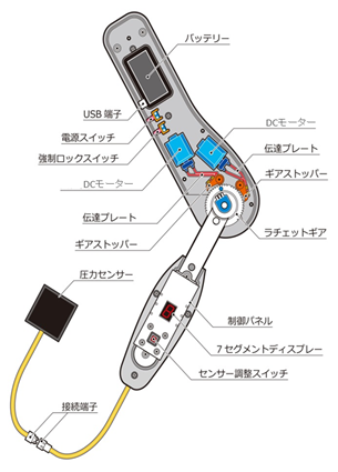 構造 | ラチェット機構を組み込んだ単軸継手。圧力センサーからの信号に応じてモーターが駆動し、継手の固定/遊動を制御する。症状にあわせてロック方向の切替が出来る。(固定・伸展or屈曲方向ロック) | |||||||