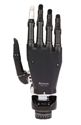 構造 | 筋電制御による電動ハンドである。母指から小指にかけて、各々の指に内蔵されたモーターがMP関節とPIP関節の連動した屈曲伸展運動を行う。母指基部にあるモータが母指CM関節の内転外転運動を行う。モーターの駆動はギヤを介してナイロン製コードの長さを調整する。基板にはプロセッサ、Bluetooth等を搭載している。 | |||||||