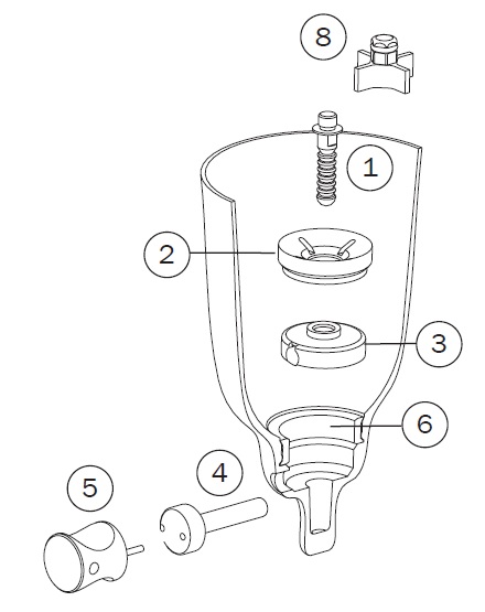 構造 ラチェットロック本体をソケット内に設置するファブリケーションリングとファンネルがネジ止めにより固定する。ライナー遠位端に取付けるアタッチメントピンはカチカチというクリック音を伴って挿入およびロックされ、側方に取付けるリリースユニットを押すことでロック解除されスリーブを抜くことができる。