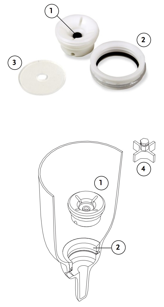 本体はプラスチック製の構造物であり、その中心に一方向へのみ空気を排出する一方向弁が取付けられている。ソケット内リングとロック抑えのネジ止めにより、ソケット内に固定する。 |