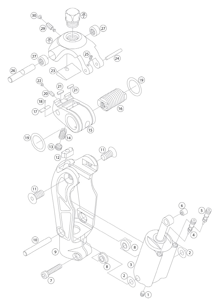 1. 近位部の組立は、ピラミッドアダプタをソケットに取付ける。 2. 足部にパイロンを立て遠位部チューブクランプに取付ける。 3. 義足長を設定する。 膝軸から測り、膝継手の高さを設定する。 4. アライメントを設定する。 |