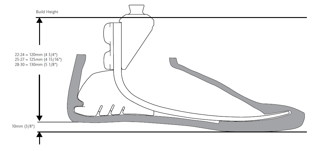 近位部は、クランプアダプタ等のメスピラミッド構造をもつパーツに接続する。アライメントは足部に適切なサイズのフットカバーを装着し、差高をあわせた状態で、近位に接続したパイロンが垂直に立ち、矢状面において足部全長の後方1/3の位置に荷重線が落ちるように調整する。 |