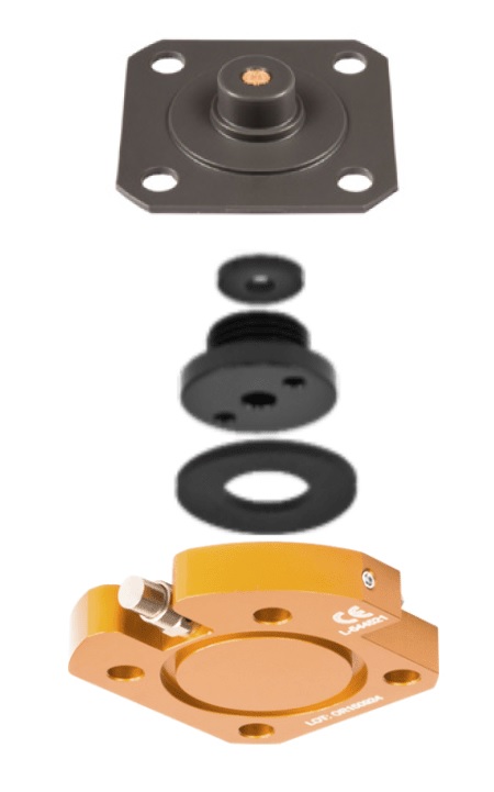 ソケットを製作した後、遠位端に専用アダプタ、シール用のゴムワッシャをつけ、その下にバルブプレートを取り付ける。バルブプレートの下には4穴ピラミッドアダプタなどを取り付け、ソケットアダプタに対して全体をネジ留めする。 |