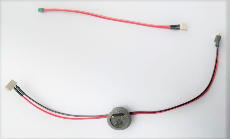 バッテリーと電動ハンドに接続する配線を有する充電端子。ソケット表面に充電端子を設置し、LEDインジケーターの確認が可能。ラミネーション用ダミーが付属する。 |