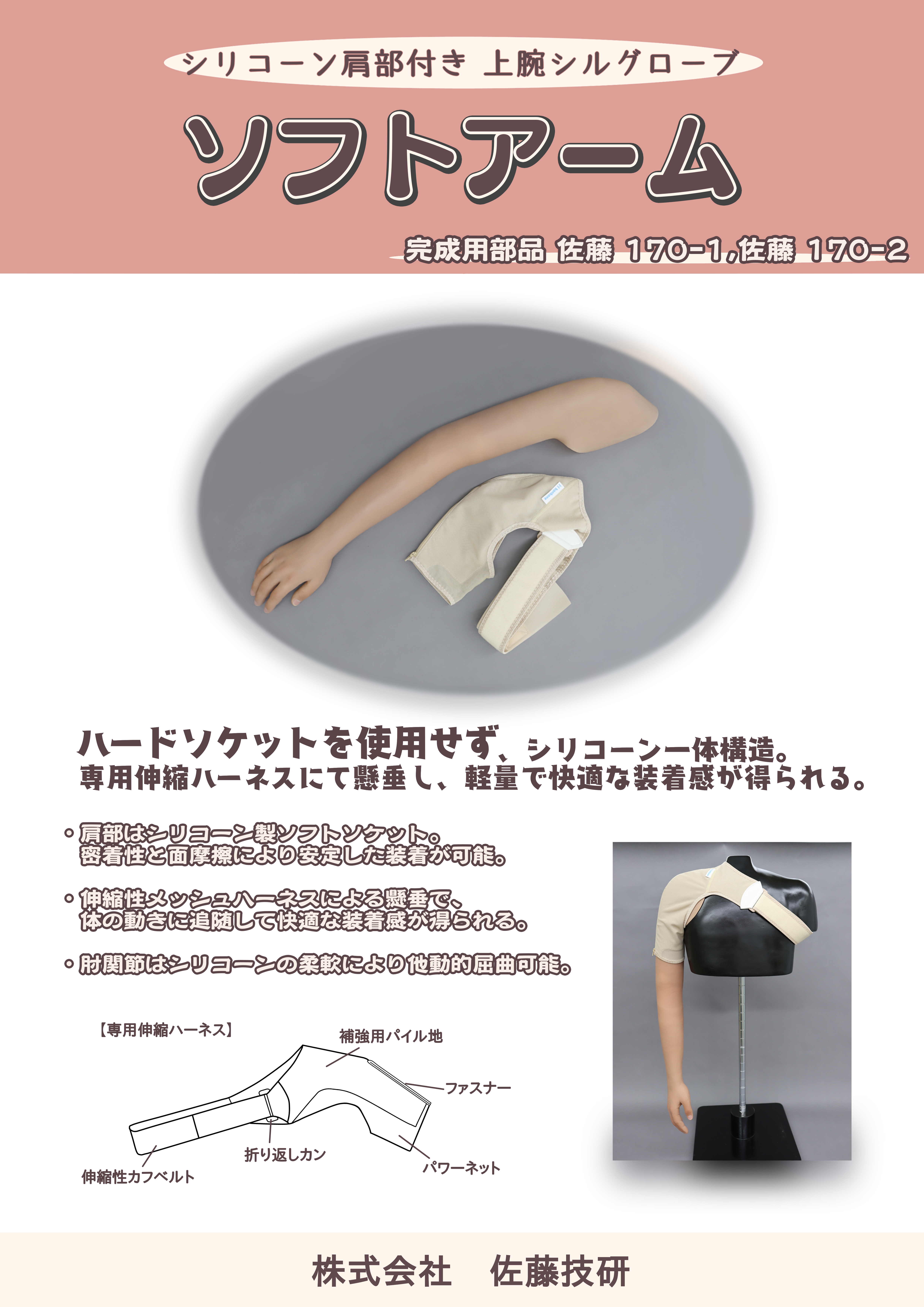 肩部がハードソケットではなく、シリコーン製ソフトソケットで、密着性と面摩擦により安定した装着が得られる。 そして専用の伸縮性メッシュハーネスによる懸垂で、体の動きに追随して快適な装着感が得られる。 肘関節はシリコーンの柔軟により他動的屈曲可能で軽量化できる。