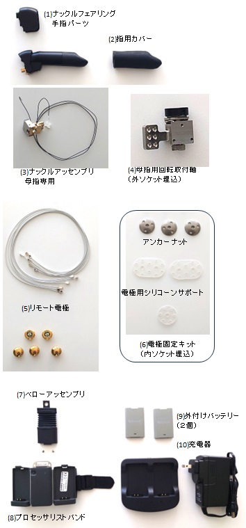 母指のみの手部切断用筋電電動義手の製作(購入)に必要な次の部品が含まれる。(1)手指パーツ(含フェアリング) (2)指用カバー (3)ナックルアッセンブリ (4)母指用回転取付軸(外ソケット埋込) (5)リモート電極(本体および配線) (6)電極固定キット(内ソケット埋込・電極用シリコーンサポートおよびアンカーナット) (7)ベローアッセンブリ (8)プロセッサリストバンド (9)バッテリー (10)充電器 |
