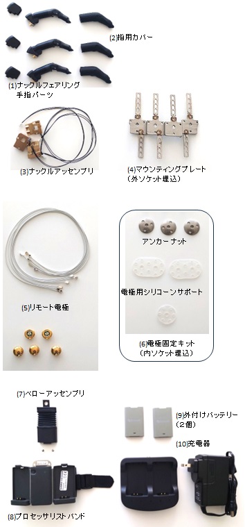 母指を含まない第2〜5指のうち3指の手部切断用筋電電動義手の製作(購入)に必要な次の部品が含まれる。(1)手指パーツ(含フェアリング) (2)指用カバー (3)ナックルアッセンブリ (4)マウンティングプレート(外ソケット埋込) (5)リモート電極(本体および配線) (6)電極固定キット(内ソケット埋込・電極用シリコーンサポートおよびアンカーナット) (7)ベローアッセンブリ (8)プロセッサリストバンド (9)バッテリー (10)充電器 |