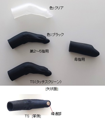 i-Digits手指パーツに装着することで、本体を保護し、表面の摩擦力により把持を補助する。TSタイプは、示指先端の導通部でタッチパネル操作が可能。 |