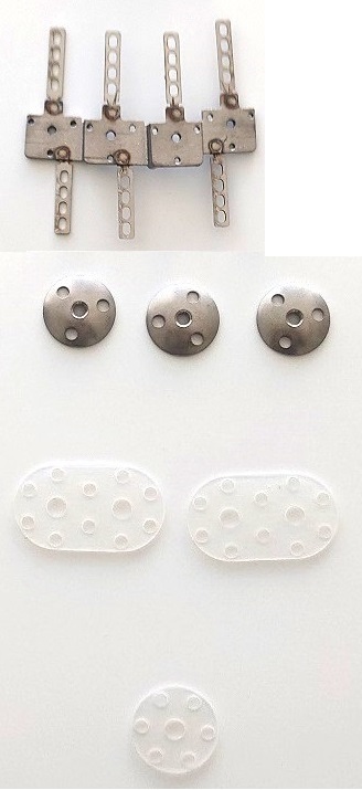 手部電動義手i-Digitsの内外ソケット埋込部品。外ソケットに埋め込まれるマウンティングプレートおよび内ソケットに埋め込まれる電極固定キットからなる。 |
