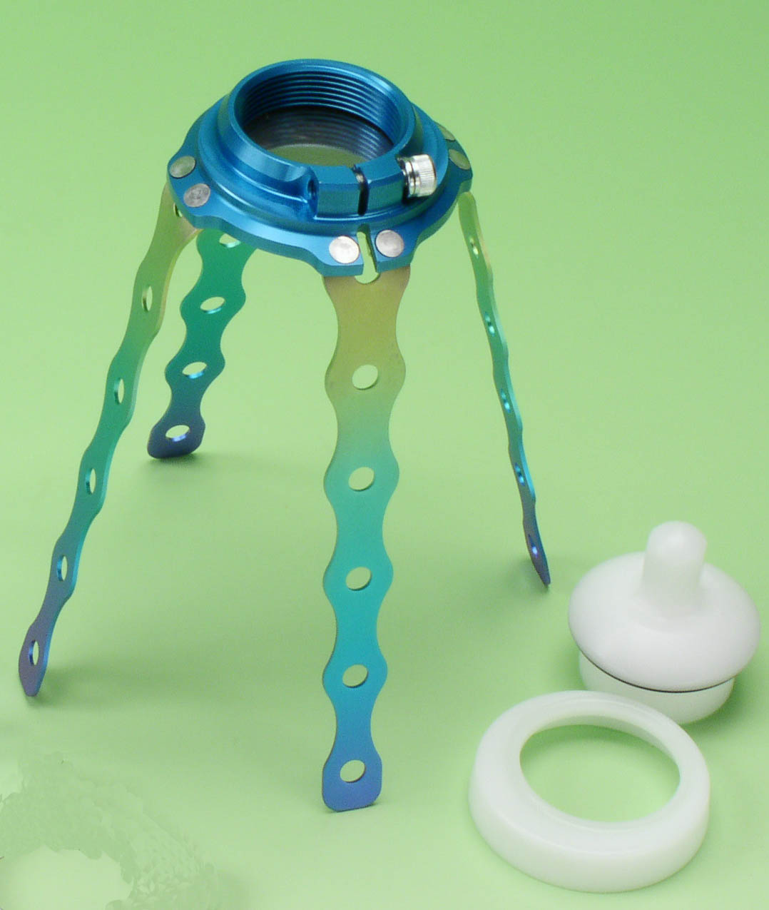 アルミ合金製本体ソケットベースにねじ受金(雌ねじM36、P1.5)を配し、接続部品をねじ込み六角穴付ボルトにて本体すり割部分を締め付けて締結する。支柱はチタン製。 |