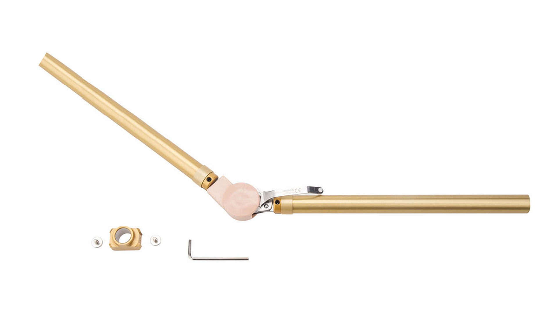 固定式肘継手。内側に健手で操作し固定と解除をおこなうレバーが付属。近位は肩継手の支柱を固定する部品で、遠位はパイプ。パイプの肘継手部品接合部に回内外を調整するネジがある。 |